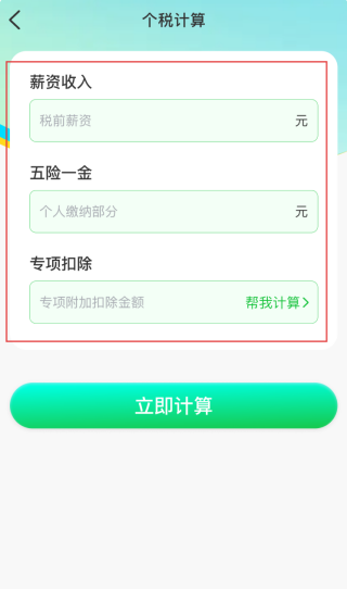 2、个税计算页面,需填写税前薪资、个人缴纳的五险一金金额,设置专项附加扣除项目后,点击【立即计算】按钮。
