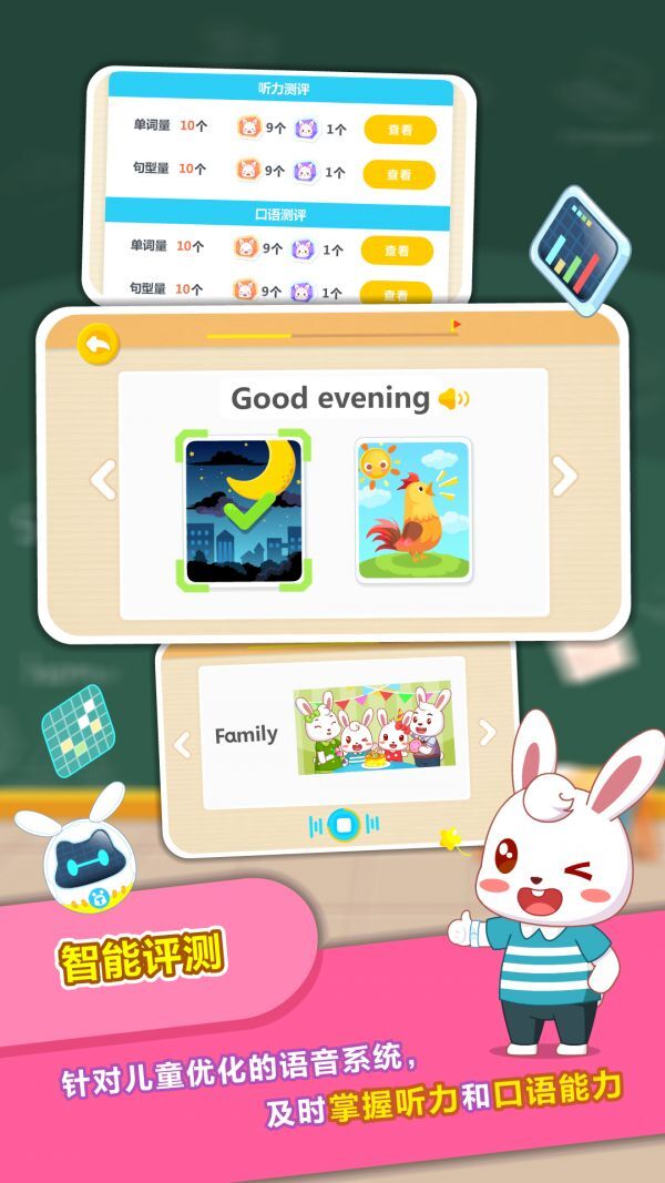 兔小贝儿童英语App配备了针对儿童优化的语音系统,能实现跟读纠错功能,帮助孩子掌握自身的听力和口语能力情况。