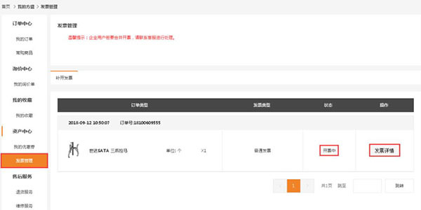 3、提交申请信息后,可前往“资产中心>发票管理”页面查看订单的开票进展,点击“发票详情”按钮即可了解具体的发票信息。