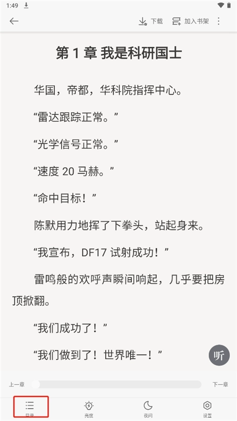 3、进入小说阅读页,我们点击屏幕中间,它会弹跳出功能页,提供目录、亮度、夜间、设置等等功能,我们点击目录;