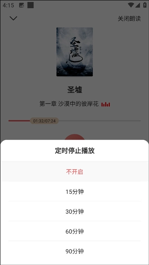 2、进入听书界面后,可使用定时、调节语速、切换章节、选择朗读音色以及边听边读等功能