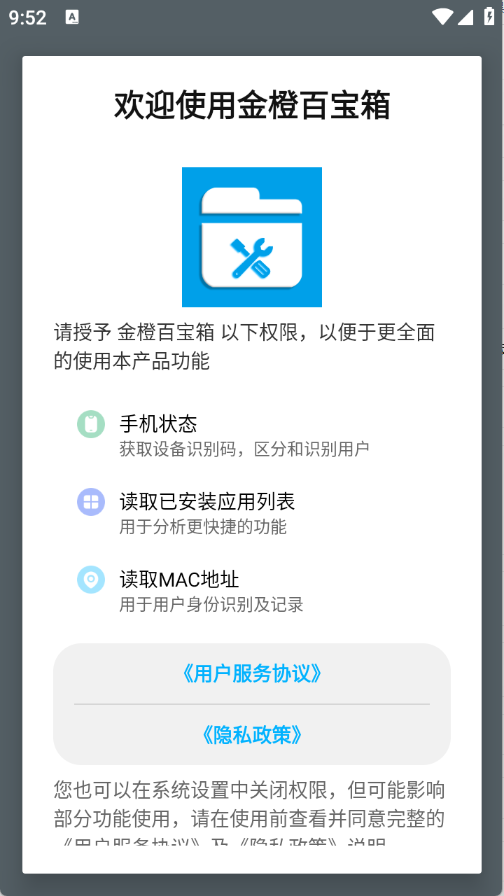 1.启动金橙百宝箱应用程序,点击同意隐私政策和用户协议