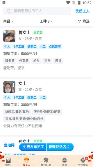 好了,现在我们再来模拟老板招聘工人的场景。首先,我们可以在鱼泡网的界面上选择“找工人”选项,通过这个功能也能筛选出许多优质的工人资源。