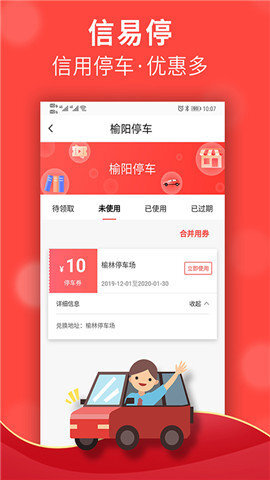我们为用户提供了与生活紧密相关的各类一站式优惠,这些优惠以信用分为基准,例如停车优惠的领取服务。