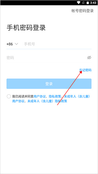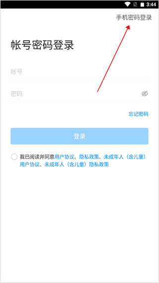 1、打开应用进入登录页面后,点击页面右上角的【手机密码登录】选项;