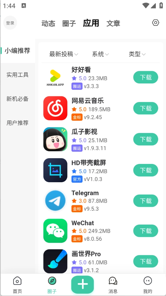 还有一个“应用”板块,里面涵盖了影视类、小说类以及社交类等多种类型,找到需要的应用后,点击“”就能使用了。