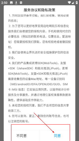 1、仔细阅读【服务协议和隐私政策】里关于信息授权、安全保护等方面的内容后,点击页面底部的【同意】按钮,完成协议确认,这样就能继续使用软件功能了。