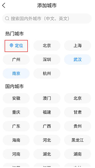 3、进入页面后,既可以直接定位自己所在的城市,也能手动进行添加。