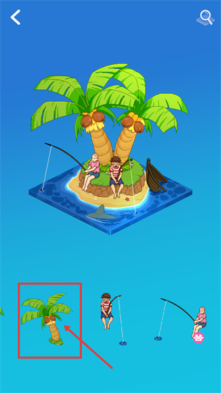 1、在岛屿场景里找到被红色框标注的【椰子树】元素,点击这个元素后,就能进入对应的椰子树组装关卡,开启该场景下的元素拼接挑战任务。