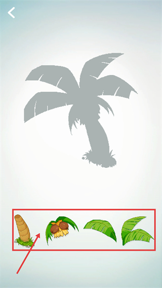 2、进入【椰子树】组装关卡后,选中红色框标注的【树干部件】,将其与上方的椰子树剪影进行匹配,以此完成该元素的基础组装环节。