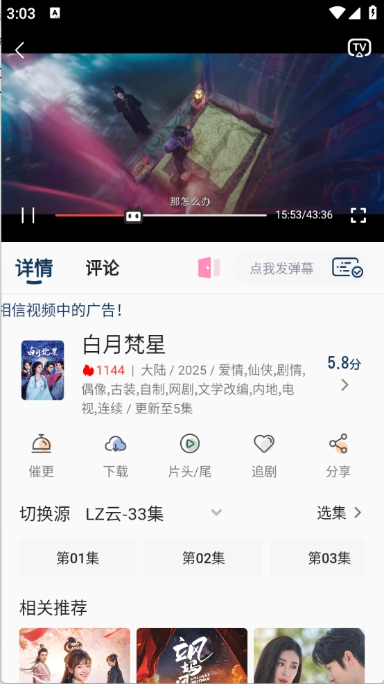 打开你想看的影片后,就能看到弹幕内容,还可以进行选集操作,也能切换不同的播放源。