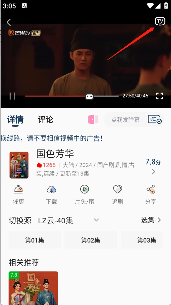 用户打开想看的影视之后点击右上角的“TV”。