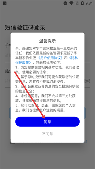 1、在【华丰智家物业版】的温馨提示里,仔细阅读【用户使用协议】和【隐私保护政策】,然后点击【同意】按钮,这样就能继续使用服务了。