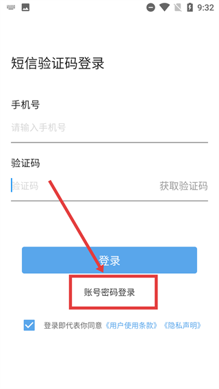 2、在【短信验证码登录】页面,完成必要的勾选操作后,可点击页面下方的【账号密码登录】选项来切换登录方式。
