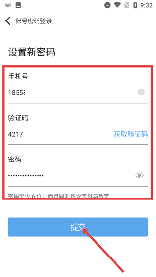4、进入【设置新密码】页面后,填写以【1855开头】的手机号码和验证码,设置一个至少6位且包含字母与数字的密码,最后点击【提交】按钮即可完成操作。