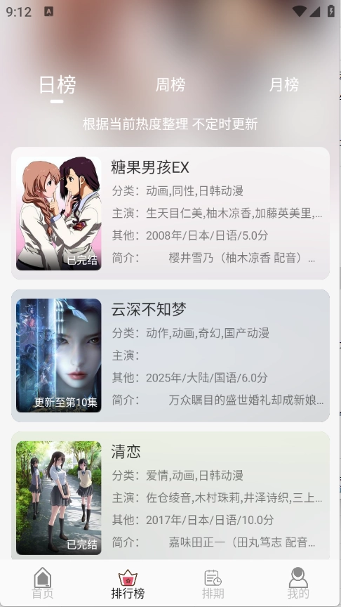 排行榜根据当前热度将动漫进行了排序。
