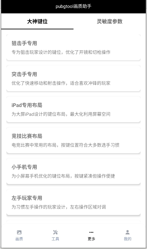 6、在「更多」栏目中集成职业级键位模板与灵敏度矩阵,涵盖压枪流、瞬狙流、跑打流等主流打法,支持导入/导出配置;