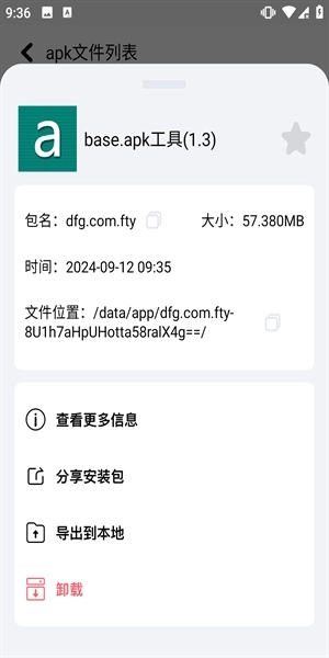 2、点击“查看更多”按钮可浏览全部APK文件,在此处点击任意文件,即可查看该软件的包名、存储位置、文件大小等详细信息。
