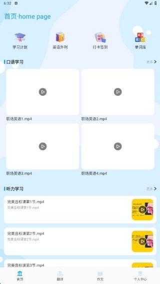 1、完成安装并进入应用后,在首页能看到学习计划、英语外刊、打卡签到、单词库等各项功能。