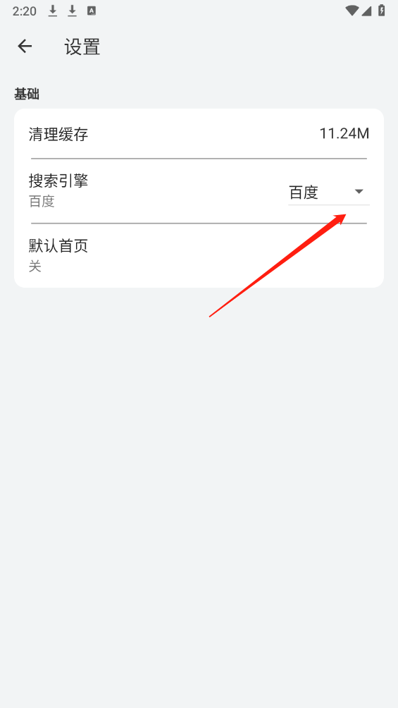 3、在“搜素引擎”页面点击箭头指示标志。