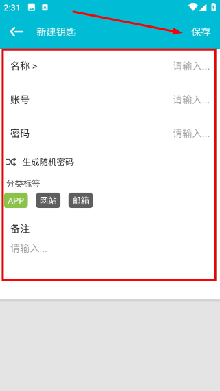3、点击页面右上角的“+”按钮,即可进入新建钥匙的编辑界面,以便添加新的账号密码信息。