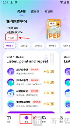 3. 也能点击课程页面,切换至当前学习的课程教程,进行同步口语练习