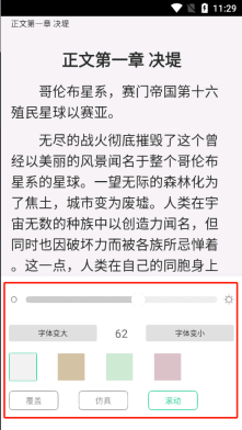 4、阅读设置:进入小说阅读界面后,可通过调整字体大小、背景颜色、亮度等参数,来营造更舒适的阅读感受。