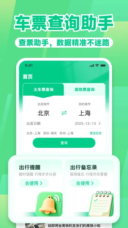 1、提供了高铁火车票的查询,用户可以一键查询车票,输入目的地来进行搜索。