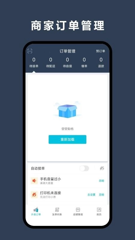 1、开启一键自动接单功能,能够高效处理各类外卖订单,助力商家提升接单效率。
