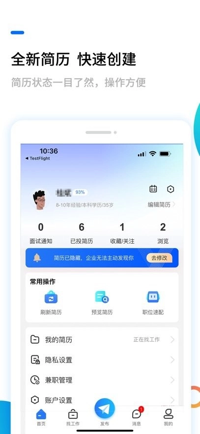 2、【简历创建】:呈现简历填写的完整程度,并推荐与简历相匹配的职位。