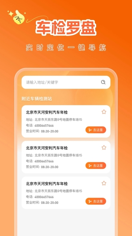 2、在附近车检页面,你能够查看周边所有汽车年检检测站的信息,还可以通过输入地址或关键字进行搜索。