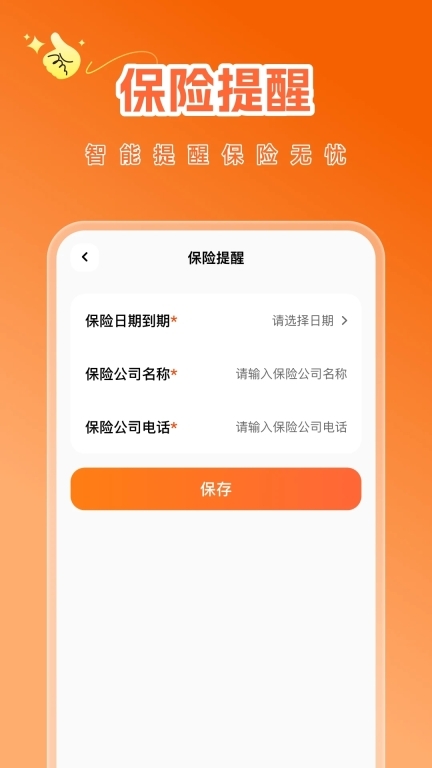 3、在保险提醒页面选定保险日期、保险公司名称与联系电话,随后点击保存操作就完成了。