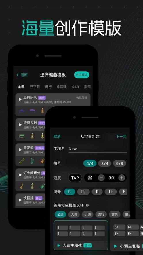 包含和弦模板、曲风模板、作品曲库,支持多风格编曲模板切换。上百种音色组合×上千种乐器奏法任你搭配,激发音乐灵感,创造无限可能。