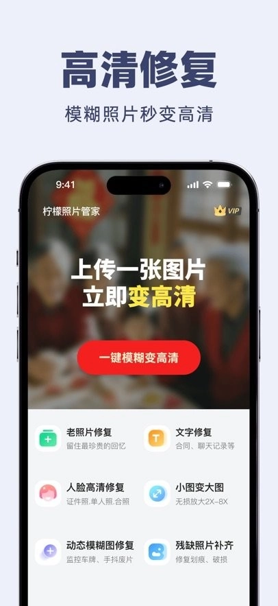 柠檬照片管家,一键高清修复功能,轻松搞定模糊照片、老照片以及低分辨率照片的画质问题。让每一张图片都能变得更清晰、更出彩!助您的珍贵照片重拾光彩,带您重温往日时光!