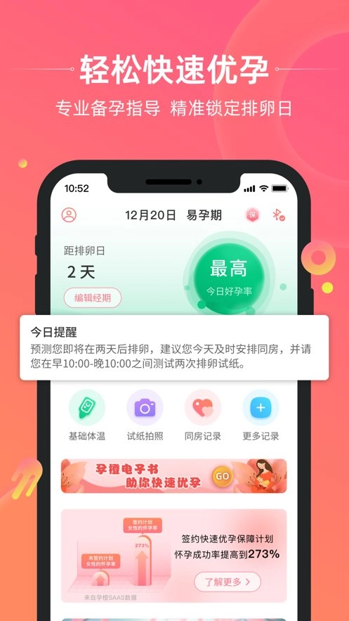 自然备孕的得力助手,专为女性打造的备孕帮手!作为国内较早运用大数据科学计算女性排卵日与生理周期(涵盖安全期、易孕期等阶段)的企业;已助力数十万女性开展健康管理,更有数万女性借助它成功实现自然怀孕!