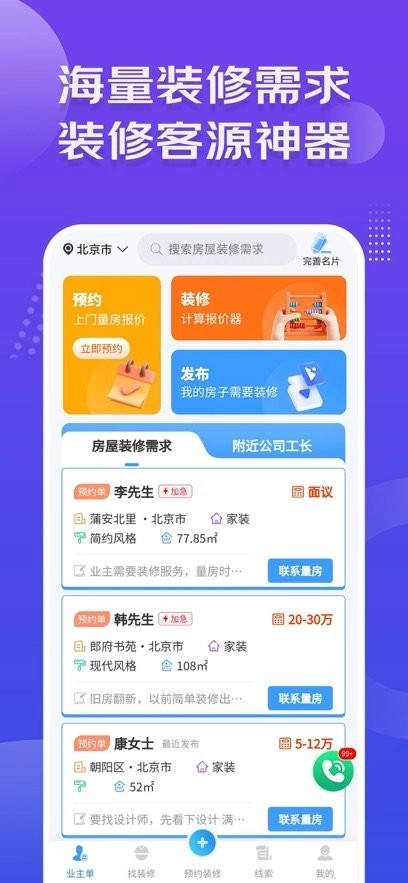 海量装修需求市场下,工长与装修队可直接对接装修业主,实现施工环节的直达服务!