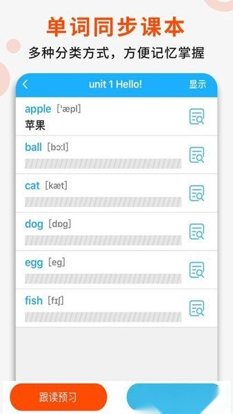 课本点读功能:与教材内容同步,拥有纯正的发音和贴心的翻译服务,支持点读、连读以及复读操作。