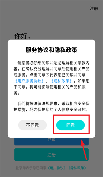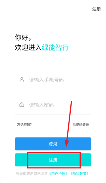 安装并打开绿能智行,先同意服务协议和隐私政策