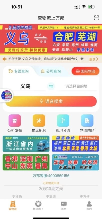 1.查找物流专线时,您可以使用语音搜索功能(例如直接说出“义乌到上海”),系统会筛选出所有相关的物流专线信息。在这些专线信息页面,您能够直接与物流商家在线沟通,进行询价和发货操作,还可以查看商家的门店信息、运营线路以及门店或线路对应的地址等内容。