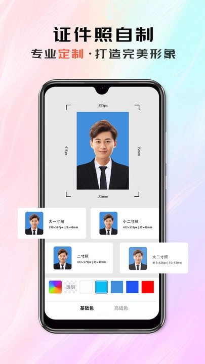 一键生成证件照,多种高级底色模板随心切换,还能一键调整多种证件照尺寸。