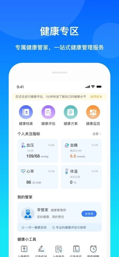 计步器、饮食管理、健康档案,还有贴心的健康管家会始终在你身边,助力你的健康更上一层楼。
