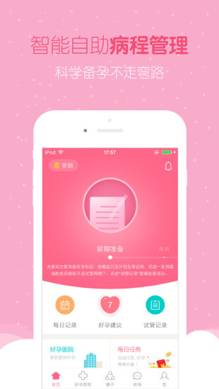 2、在备孕、试管婴儿、怀孕这三个环节中,对身体状况、检查等信息进行详细记录并形成病历,系统会智能反馈有助于好孕的相关建议。