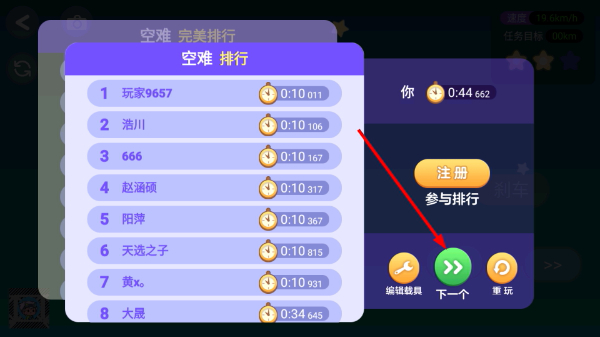 4、当关卡完成后,在排行界面找到“下一个”按钮并点击,就能开启下一个关卡的挑战,从而继续推进游戏流程。