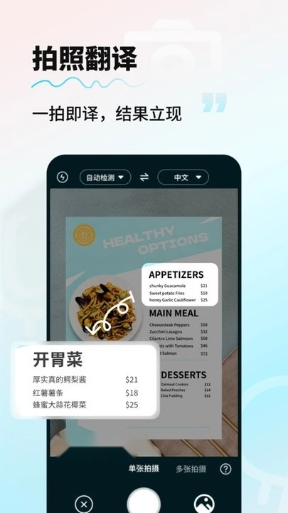 拍照翻译:具备强大的OCR摄像头取词与拍照翻译能力,只需轻轻一拍就能完成翻译,无需手动输入就能快速处理英语、日语等多种语言的翻译需求,无论是出国交流、旅行途中还是旅游购物时的翻译,或是英语学习过程中的翻译需求,都能轻松满足。