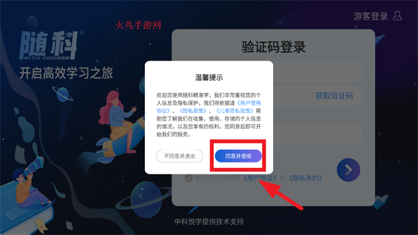 安装并打开随科精准学应用,进入温馨提示页面后点击“同意并使用”按钮。