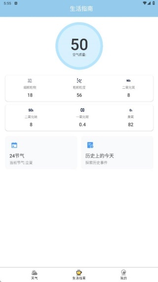 2、生活指南页面呈现了空气质量参数信息、秒速对比功能,以及节气与历史事件的查询服务。