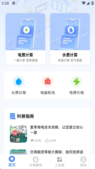 1、支持一键计算水电费,同时清晰展示水价、电价、电器耗电量等数据,页面最下方还设有夏日用电科普板块;