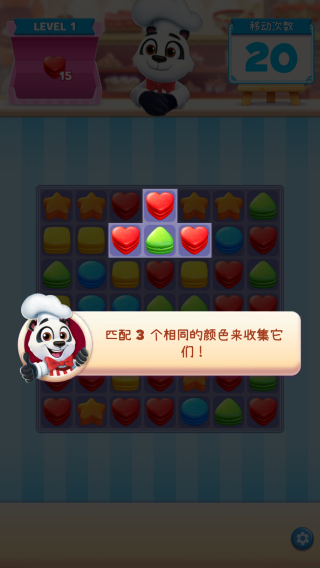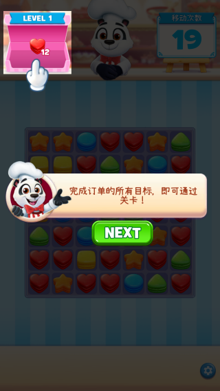 1、在关卡里,把相同的糖果(像蓝糖果、黄糖果这类)移动到相邻的位置排列起来,就能触发消除效果,同时朝着左上角显示的甜甜圈、巧克力等目标数量推进进度。