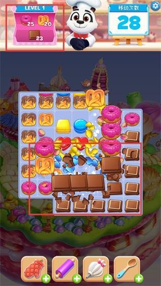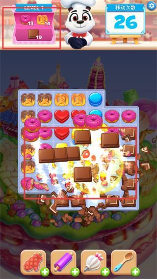 3、在消除巧克力的过程中,同步收集甜甜圈类糖果,逐步达成左上角那两种目标数量的要求。