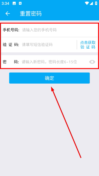 2、进入密码重置页面后,按顺序填写手机号码、获取并输入验证码、设置新的密码,全部完成后点击“确定”按钮,就能完成密码重置操作。